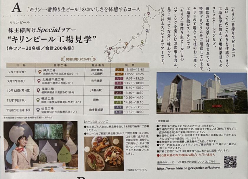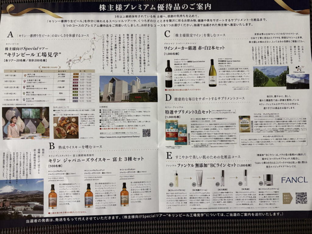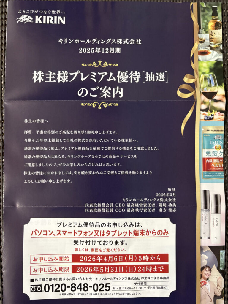 一番搾りやラガーなどのビールや、午後の紅茶などノンアルコール飲料のメーカーとしておなじみのキリンHD(2503)から、長期保有者限定の特別抽選優待の案内が届きました。