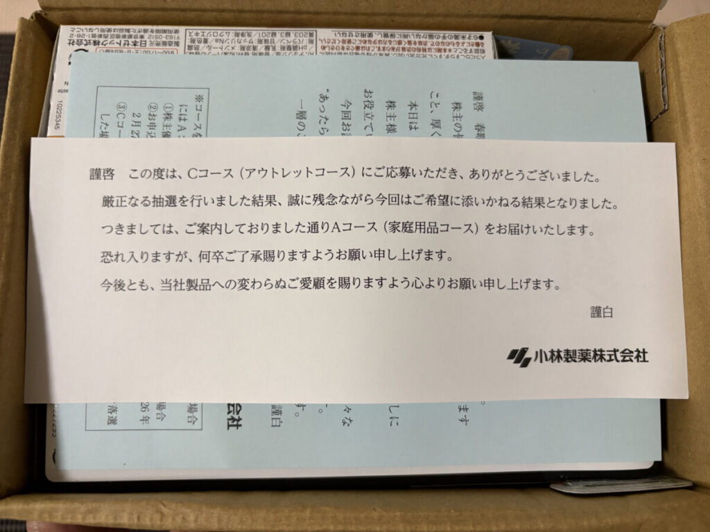 こちらの優待は事前に選択したものが届くのですが、抽選の「アウトレットコース」を選択すると【当たればアウトレット、外れると家庭用品Aコース】という結果となります。