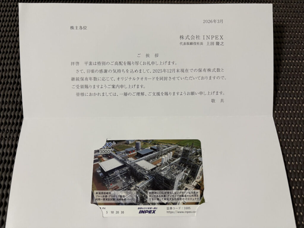 ガスや原油開発の国内大手、INPEX(1605)から株主優待をいただきました。