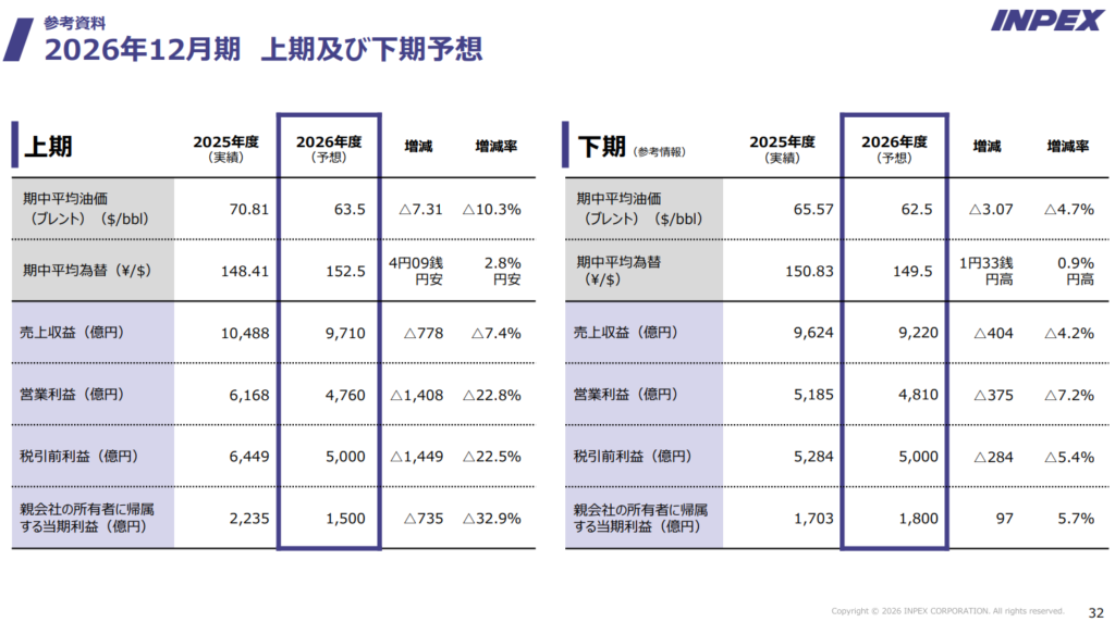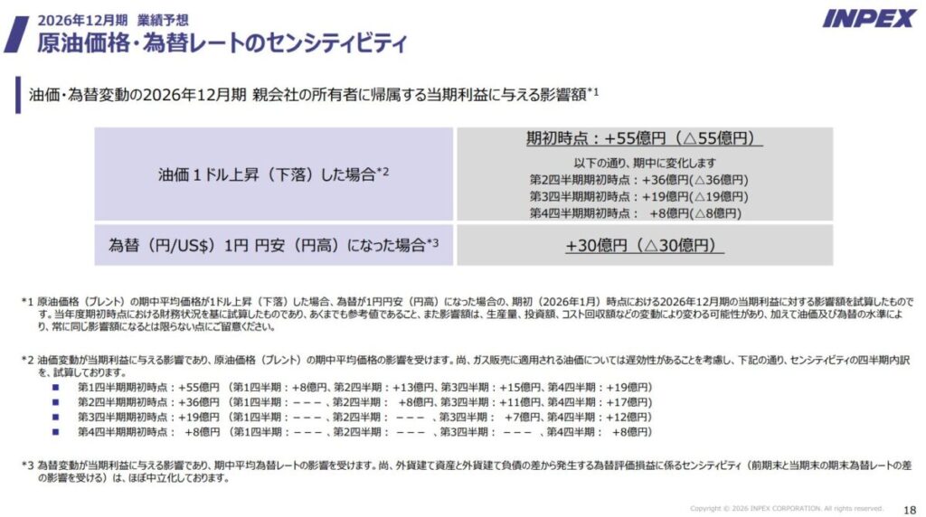 INPEXの業績予想を見ると、2026年12月期の油価は1バレル62.5~63.5ドルあたり、ドル円は149.5円~152.5円あたりで計算されているようです。