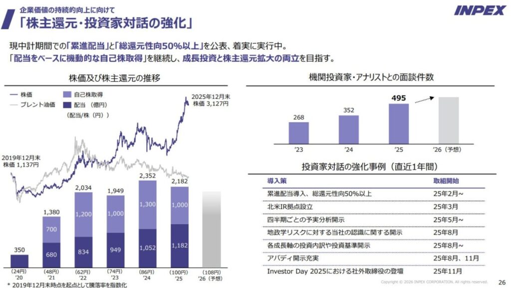 INPEXは累進配当、更に総還元性向50%以上を掲げているので自社株買いや増配が大きくなるかもしれませんね。