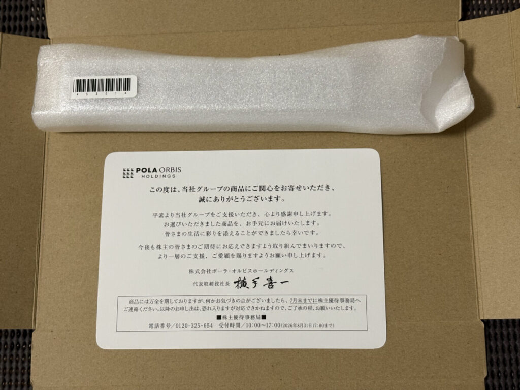 タイトルの通りここ数年ずーーーーっと株価は不調、そして業績も黒字ながら心もとない状況が続いているのに配当も優待も安定しているポーラオルビスHD(4927)から株主優待が到着しました。