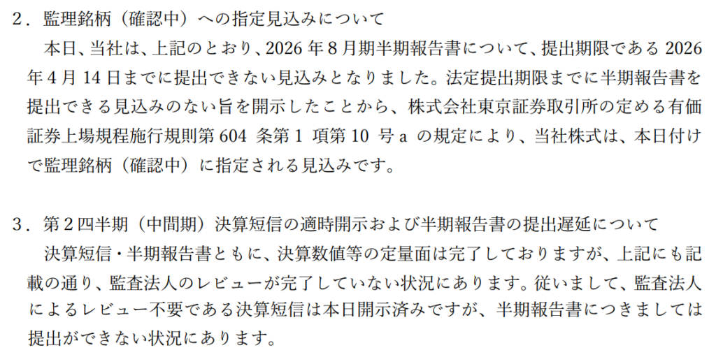 社内向けストックオプションの行使価額修正に関して問題があり、期限までに半期報告書が提出できなかったとの事。