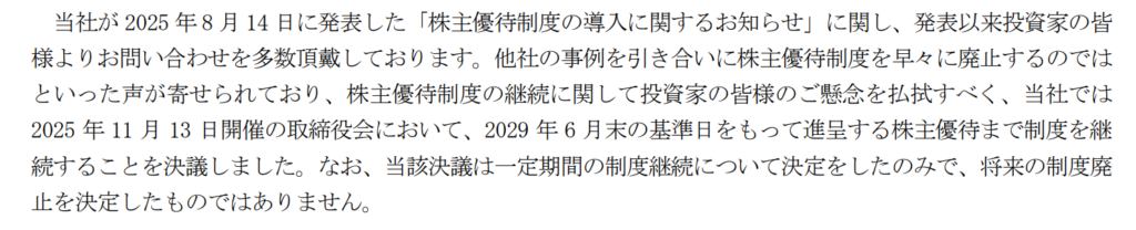 一応2029年6月権利までは優待制度を継続すると発表しているので信じてみましょうか。